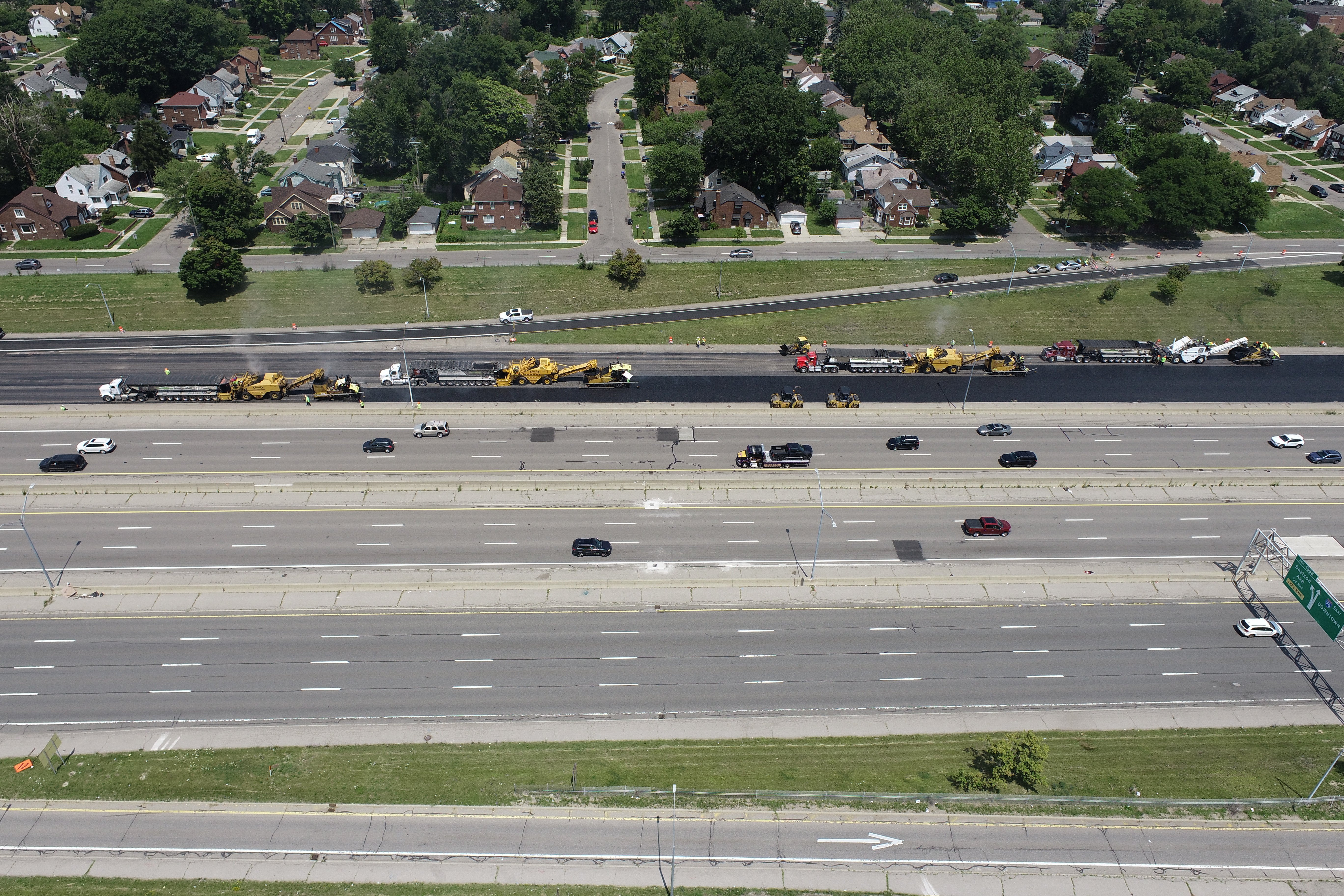 Paving on I-96 in Detroit between Fullerton Ave and M-39 is 28,220 tons of 2-inch stone matrix asphalt in 5.25 miles of 2/3/4 lanes of Echelon paved highway (a separate material transfer device is required by each paver). Echelon paving is achieved through full weekend closures in stages. This project also includes ramps and some service drive paving.